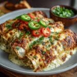 These Amazing 20-Minute Green Chile Chicken Enchiladas are a flavorful and comforting Mexican-inspired dish featuring tender shredded chicken wrapped in soft tortillas, smothered in tangy green enchilada sauce, a creamy cheese mixture, and baked to bubbly perfection. Ideal for a quick weeknight dinner, they combine the zesty kick of diced green chiles with the creaminess of sour cream and Monterey Jack cheese, garnished with fresh cilantro for an extra burst of freshness.