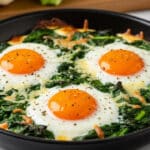 - Add the Eggs: Using the back of a spoon, create four small wells in the spinach mixture. Carefully crack one egg into each well, taking care to keep the yolks intact. Season the eggs lightly with salt and pepper.