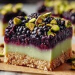 These Blackberry Pistachio Dream Bars feature a buttery, crumbly crust topped with a luscious cooked blackberry filling and a crunchy pistachio topping. Perfect for summer gatherings or a sweet treat, they combine the tartness of fresh blackberries with the nutty crunch of pistachios in a delightful baked bar.