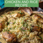 Keywords: creamy chicken recipe, smothered chicken, chicken and rice dinner, cheesy chicken, skillet chicken recipe, easy chicken dinner