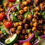 Crispy and flavorful oven roasted chickpeas made with simple ingredients. A healthy, high-protein snack or crunchy topping for salads and soups.