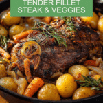 - Serve: Slice the rested fillet steak and serve alongside the roasted vegetables with the homemade gravy on the side.