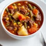 A hearty and comforting Vegetable Beef Soup made with tender pot roast, a medley of fresh and frozen vegetables, rich beef broth, and flavorful tomato soup, perfect for a warming meal any time of year.
