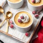 Three white ramekins filled with a smooth, pale yellow custard, each topped with a small dollop of white whipped cream and two red frosted cranberries, sitting closely together on a rustic white wooden tray with a distressed finish. The custard layers are thick and creamy with a few specks of darker spice sprinkled on top. The tray rests on a white marbled surface, accompanied by two gold spoons partially visible in the background and a black handle of a kitchen tool in the foreground. A red cloth appears at the edge of the scene, adding a festive touch. The photo taken with an iphone --ar 4:5 --v 7