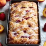 A golden-brown baked pastry in a rectangular black baking tray sits on a white marbled surface. The pastry's top layer is soft and fluffy with a shiny glaze of white icing drizzled unevenly across. Deep red patches of fruit filling, likely strawberry or berry jam, peek through the light crust in several places. The pastry looks thick and pillowy, with the crust slightly puffed and textured. Around the tray, out-of-focus whole and sliced strawberries and soft peaches add a fresh, ripe touch to the scene. Photo taken with an iphone --ar 4:5 --v 7