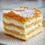 This irresistibly creamy and easy Napoleon Cake recipe is perfect for home bakers looking to create a classic French dessert featuring layers of flaky puff pastry and smooth vanilla custard. The cake is elegantly finished with powdered sugar and optional fresh berries, making it a visually stunning and delicious treat for any occasion.