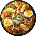 - Serve: Spoon the kedgeree onto a large serving platter or distribute onto individual plates. Top with halved or quartered hard-boiled eggs and garnish with the remaining coriander leaves. Serve immediately and enjoy this flavorful, comforting dish.