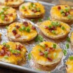 Loaded Baked Potato Rounds are a delicious appetizer or snack featuring crispy, buttery red potato slices topped with melted Monterey jack and cheddar cheese, savory bacon crumbles, and a sprinkle of garlic salt with parsley. Perfectly baked to golden perfection and served with sour cream for dipping, these rounds combine classic baked potato flavors into bite-sized treats.