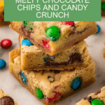 Keywords: M&M cookie bars, chocolate chip cookie bars, easy dessert recipe, baked cookie bars, colorful cookies, party dessert