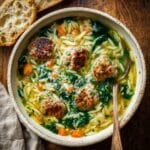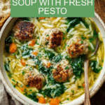 This hearty meatball minestrone is a comforting twist on the classic Italian soup, packed with tender beef meatballs, tender vegetables, and flavorful herbs. Finished with pesto and fresh basil, it’s perfect for a satisfying weeknight meal that warms you from the inside out.