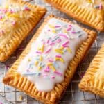- Glaze and Decorate: Spread the glaze over the cooled pop tarts, leaving a small edge uncoated. Optionally, add sprinkles and allow glaze to set before serving.