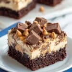 A square piece of dessert with two distinct layers sits on a white plate over a light blue cloth, on a white marbled surface. The bottom layer is a dense, dark brown fudge brownie with a slightly crumbly texture. Above it is a thick, creamy layer of light beige cookie dough mixed with small chocolate chunks and swirls of darker chocolate spread throughout. On top of this creamy layer, several thick pieces of cut chocolate candy and small peanut butter chips are scattered, adding texture and color contrast. The background reveals a tray with more of the same dessert, slightly blurred. Photo taken with an iphone --ar 4:5 --v 7