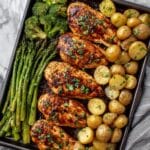 This Sheet Pan Garlic Butter Chicken and Veggies recipe offers a simple, delicious, and healthy meal made with tender chicken breasts, flavorful garlic butter sauce, and a mix of roasted baby potatoes, broccoli, and asparagus all cooked together on one pan for easy cleanup.