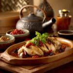 Sizzling ginger steamed fish is a light and flavorful dish showcasing delicate white fish fillets infused with fresh ginger, green onion, and a splash of soy sauce. The final touch of hot oil poured over the aromatics creates a delightful sizzle that elevates the dish’s fragrance and taste. It’s a simple yet impressive meal perfect for any occasion.