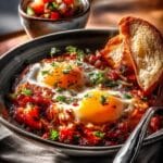 - This dish pairs well with crusty bread or warm flatbreads for dipping into the sauce and runny yolks.