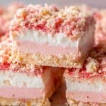 These delightful Strawberry Crunch Brownies feature a moist strawberry-flavored brownie base topped with a creamy, tangy cream cheese frosting layer. The combination of the sweet cake mix, white chocolate chips, and smooth frosting creates a luscious dessert perfect for any occasion.
