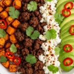 - Assemble Bowls: Once all components are ready, divide the roasted sweet potatoes evenly into serving bowls. Top each portion with the seasoned beef, followed by spoonfuls of fresh pico de gallo, creamy guacamole, and sour cream. Garnish with optional toppings such as chopped cilantro, lime wedges for squeezing, or crumbled cheese to enhance the flavors. Serve immediately and enjoy.