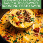 Tuscan Sausage and Potato Soup is a comforting and flavorful dish featuring savory Italian sausage, tender gold potatoes, creamy white beans, and sun-dried tomatoes simmered in a rich chicken broth. The soup is finished with a swirl of fresh basil pesto, adding a vibrant and unique flavor twist that elevates this hearty, easy-to-make meal perfect for chilly days or family gatherings.