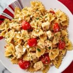 This White Wine Chicken Pasta combines tender, diced chicken breasts with a light white wine and garlic sauce, tossed with bowtie pasta, juicy grape tomatoes, and finished with crumbled feta cheese for a flavorful and easy weeknight dinner.
